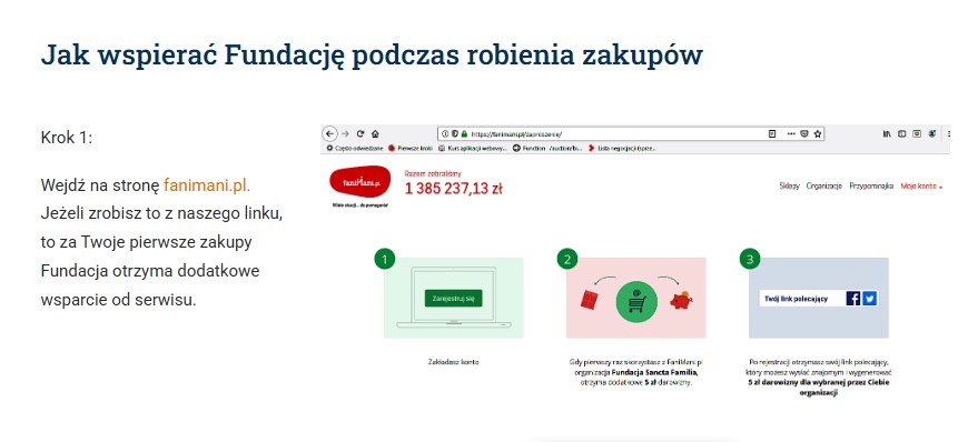 Przypominamy, że nasza Fundacja bierze udział w akcji zorganizowanej przez Fanimani.pl Dzięki temu kupując w ponad 1000 sklepów internetowych, w tym na platformie Allegro, możesz wesprzeć nas nie wydając na to ani grosza. Sklepy biorące udział w akcji przekażą nam ustalony procent od Twoich zakupów. Warunek jest jeden – logując się do sklepu musisz wcześniej …