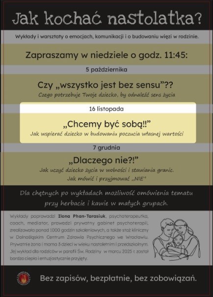 Już w najbliższą niedzielę 16.11.2025 o 11:45 zapraszamy na kolejny wykład p. Ilony Phan-Tarasiuk w parafii Św. Rodziny przy ul. Monte Cassino 68. Spotykamy się w ramach cyklu Jak kochać nastolatka, a tematem spotkania będzie wspieranie dziecka w budowaniu poczucia własnej wartości.